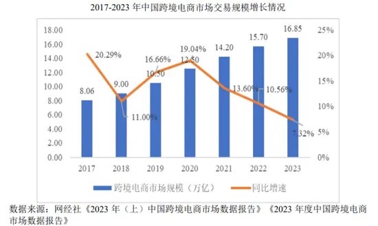 根据网经社电子商务研究中心的数据显示,市场规模从2017年的8.06万亿元增长至2023年的16.85万亿元,2023年中国跨境电商市场规模同比增长7.32%。